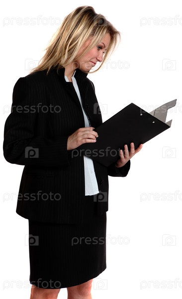 Портрет молодой деловой женщины с документами в руках на белом фоне