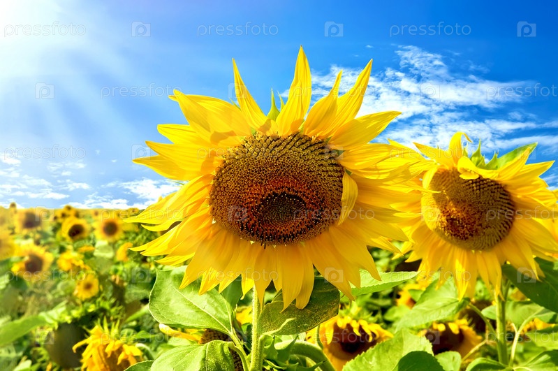 Цветущие подсолнухи в поле на фоне синего неба