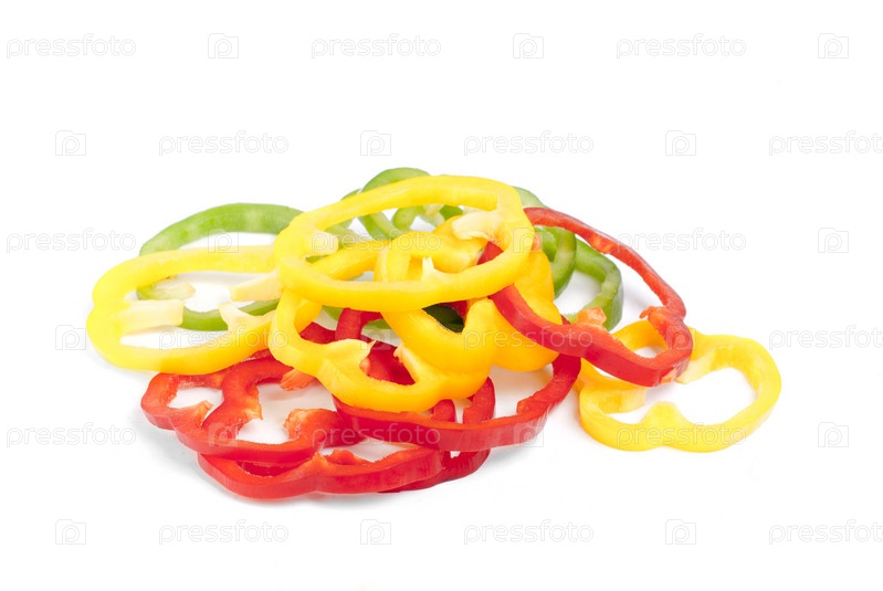 Разноцветные ломтики сладкого перца на белом фоне