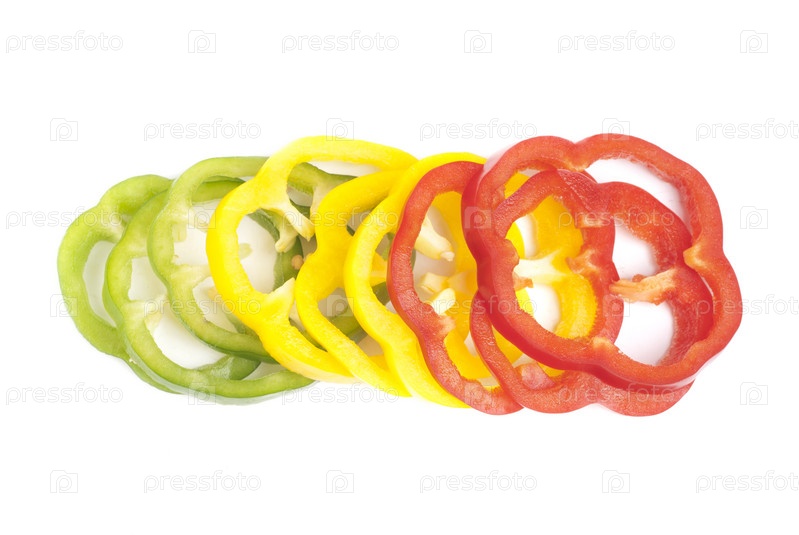 Разноцветные ломтики сладкого перца на белом фоне