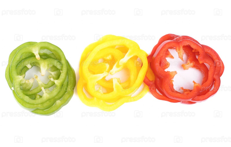 Разноцветные ломтики сладкого перца на белом фоне