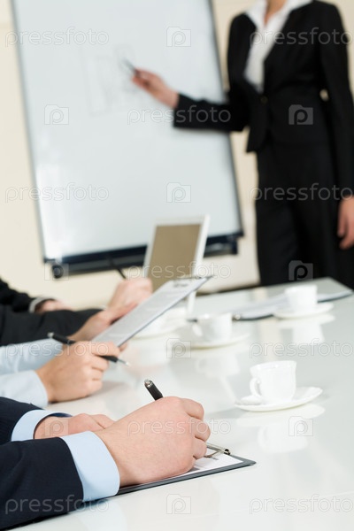 Изображение человеческих рук, делающих заметки на бумаге на семинаре или конференции