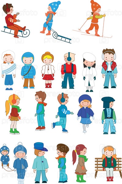 Набор мультяшных фигурок на зимнюю тему. Векторная иллюстрация