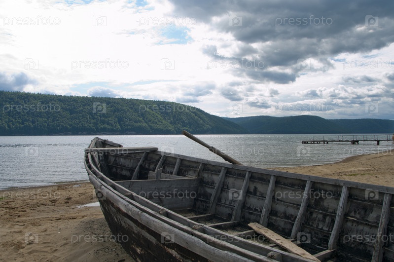Песчаный пляж, озеро и горы на фоне облачного неба. На пляже деревянная лодка крупным планом