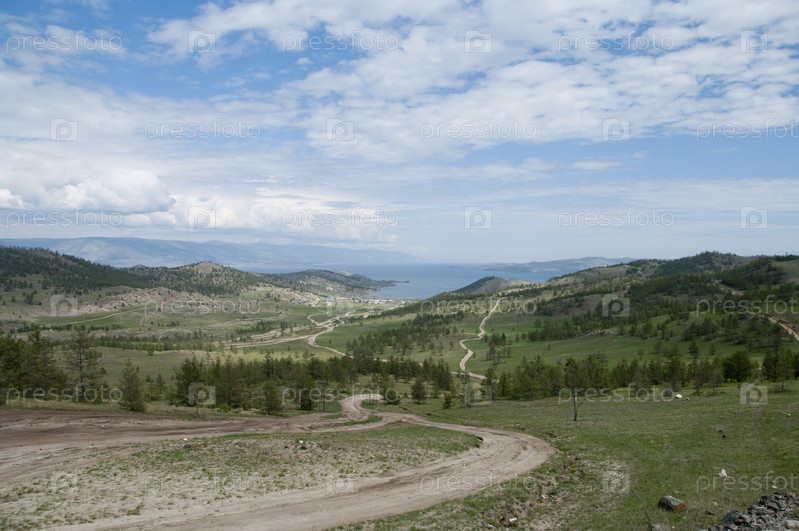 Панорама. Дороги, бегущие вдаль по холмам к озеру