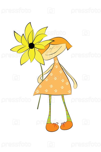 Рыжая девочка с цветком, иллюстрация на белом фоне