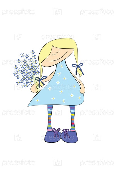 Счастливая девочка с цветами, иллюстрация на белом фоне