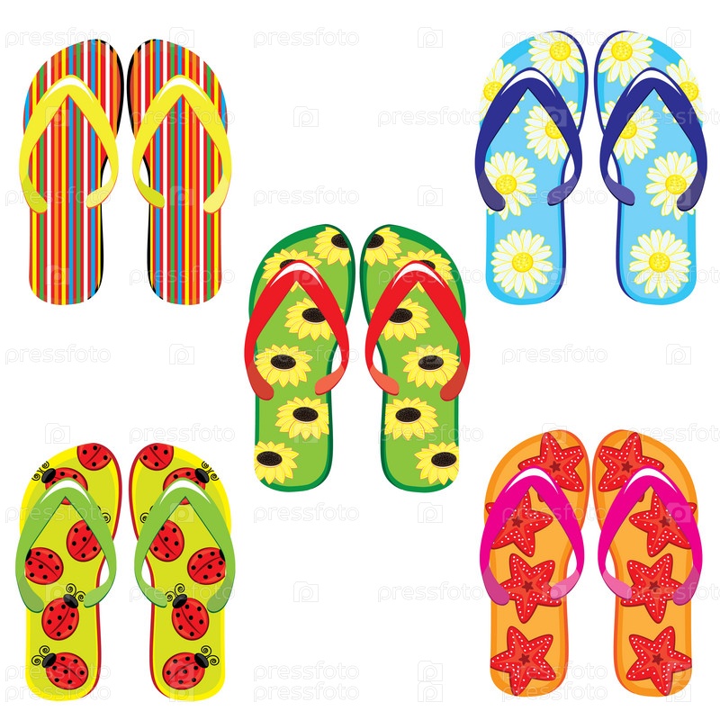 Пять пар разноцветных шлепанцев, иллюстрация на белом фоне
