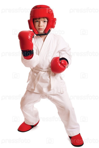 Мальчик в кимоно, боксерском шлеме и перчатках на белом фоне