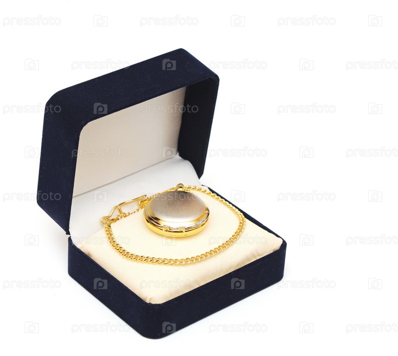 Подарочная коробочка и золотые карманные часы на белом фоне