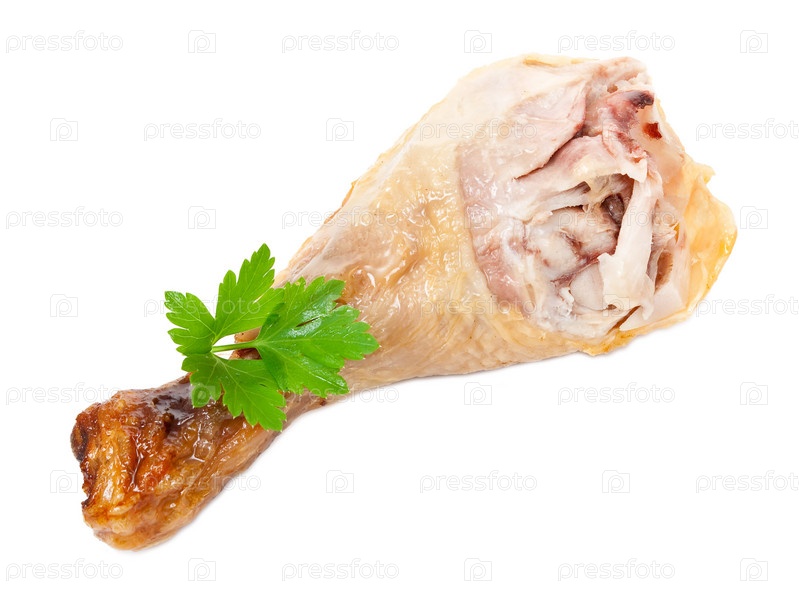 Жареная куриная ножка с листом петрушки на белом фоне