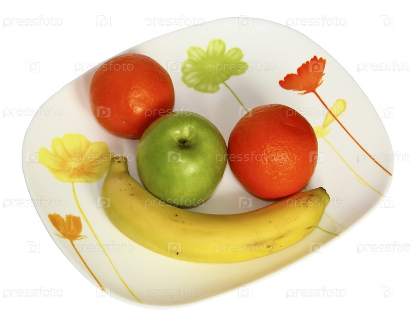 Банан, яблоко и апельсины на тарелке на белом фоне