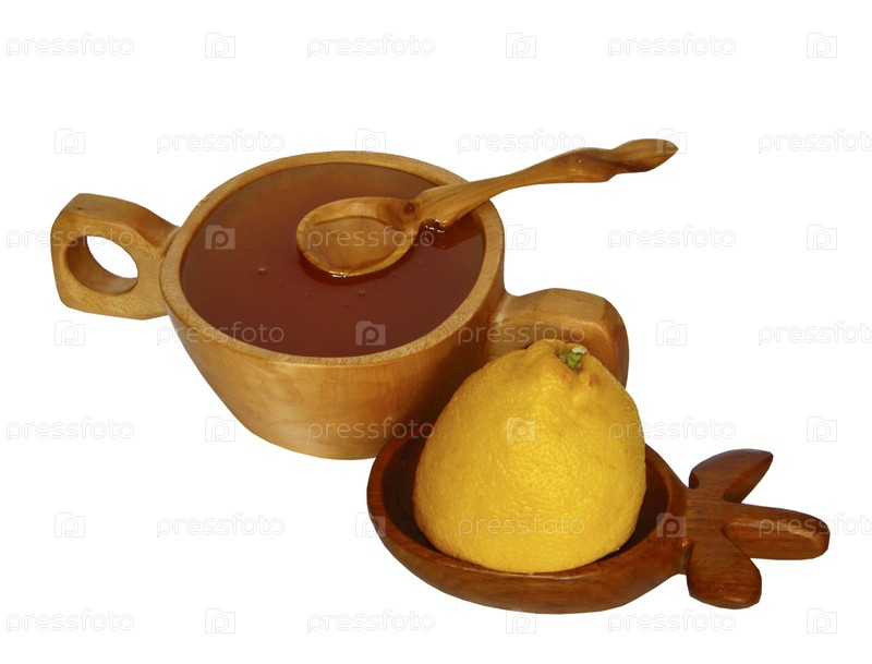 Мед и лимон в деревянной посуде на белом фоне