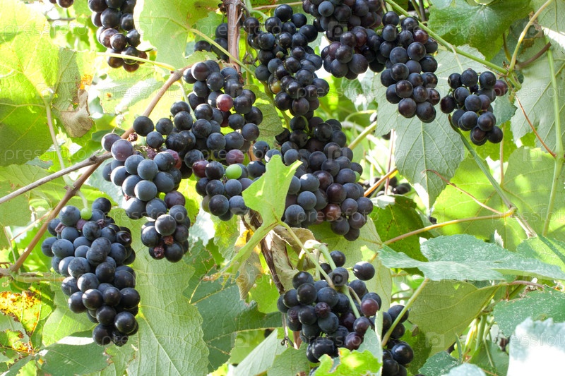 Гроздья черного винограда на кустах