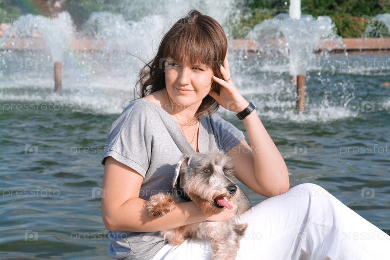 Молодая женщина со цвергшнауцером у фонтана