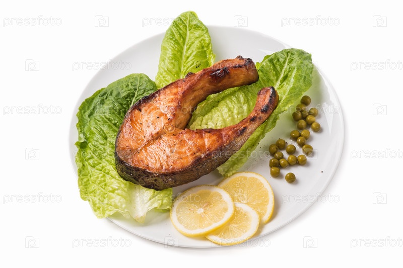 Жареная форель, лимон и зеленый горох на белом фоне