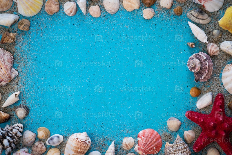 Деревянный бирюзовый фон с рамкой из морских раковин, вид сверху