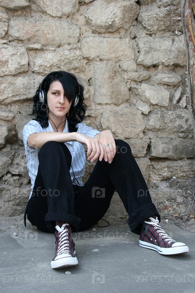 Девушка, одетая в стиле панк, слушает музыку, сидя на тротуаре