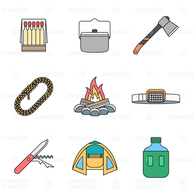 Цветные наброски различных иконок, кемпинг коллекция