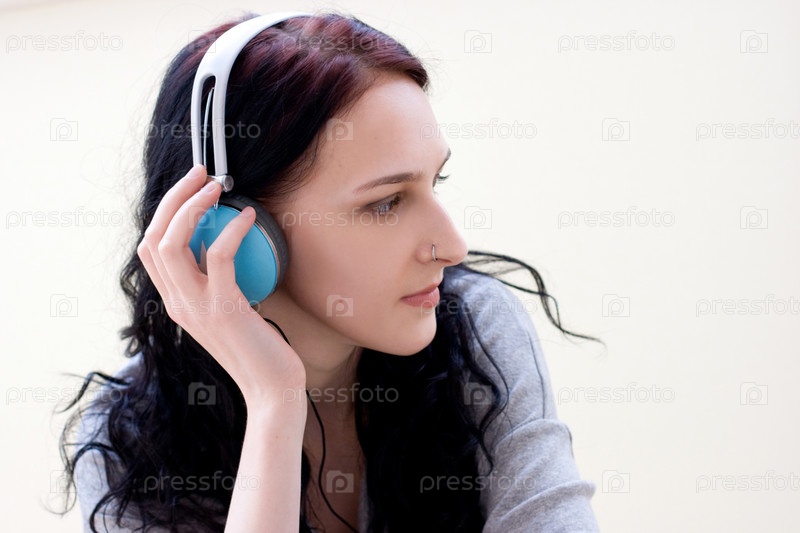 Темноволосая девушка с пирсингом слушает музыку в наушниках