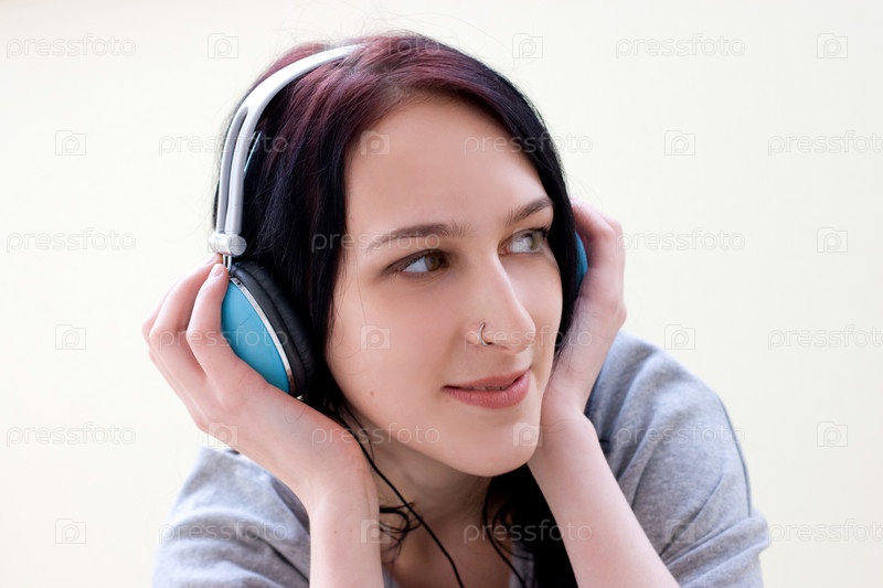 Темноволосая девушка с пирсингом слушает музыку в наушниках