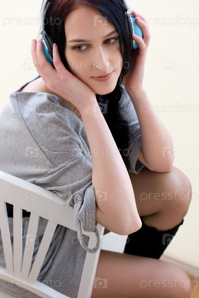 Темноволосая девушка с пирсингом слушает музыку в наушниках