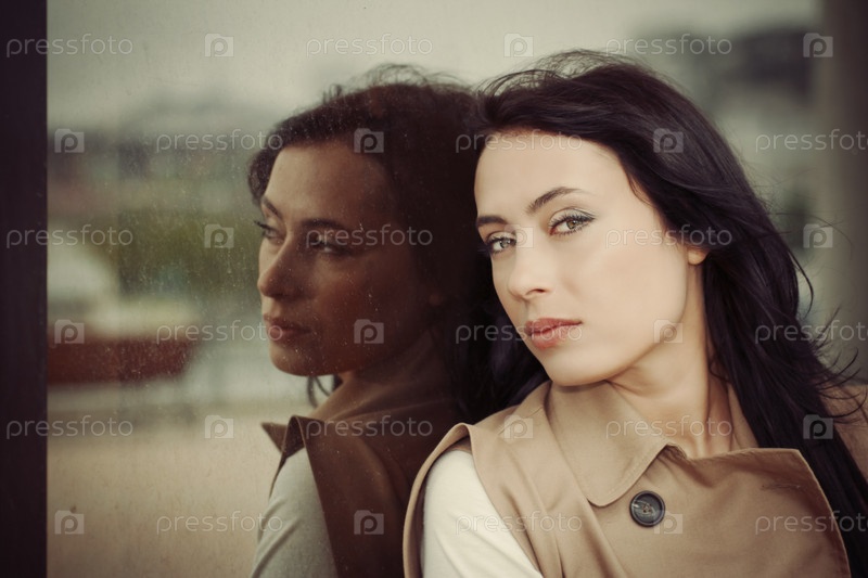 Молодая брюнетка и ее отражение в витрине