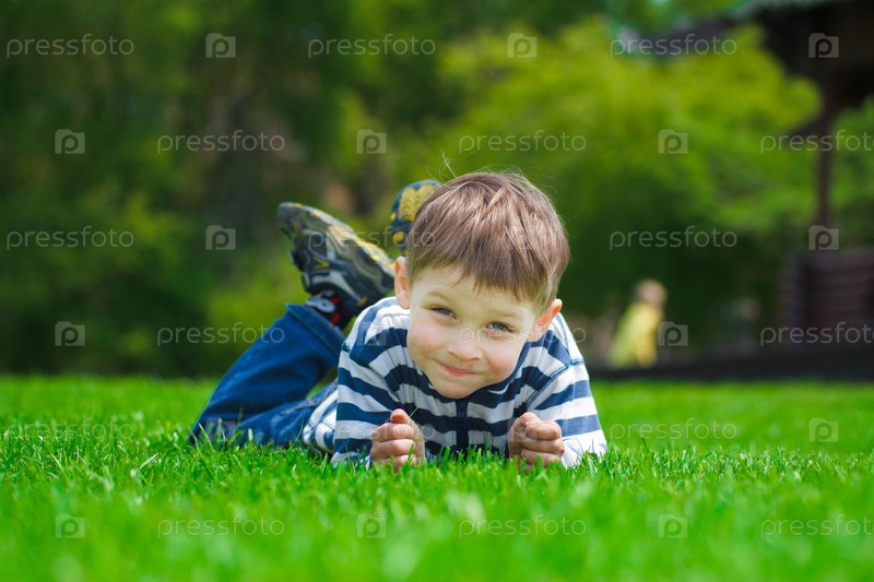 Мальчик играет на зеленой лужайке