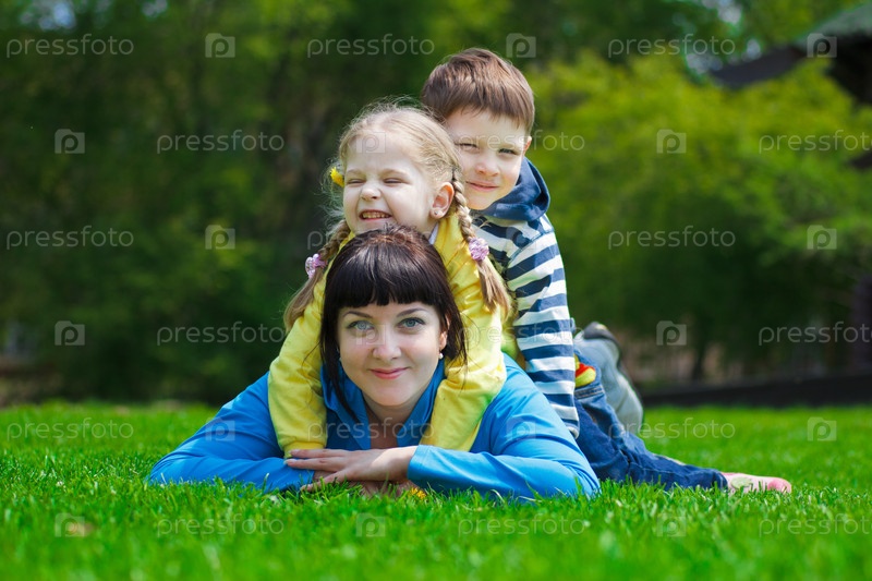 Молодая мать играет с сыном и дочерью на природе