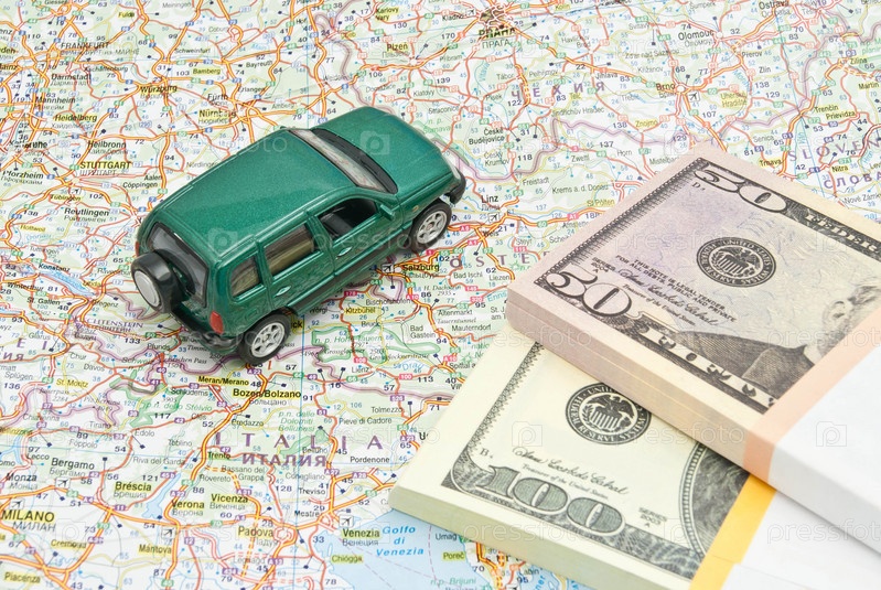 Деньги и игрушечный автомобиль на карте
