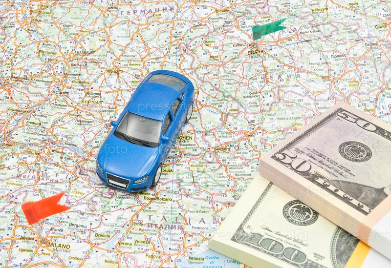Деньги и игрушечный автомобиль на карте