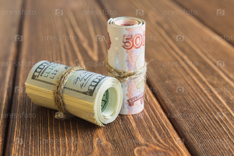Долларов и рублей укладывают на деревянный стол
