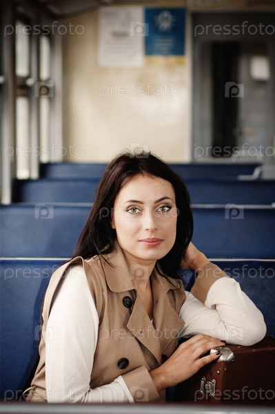 Молодая брюнетка с чемоданом едет в поезде