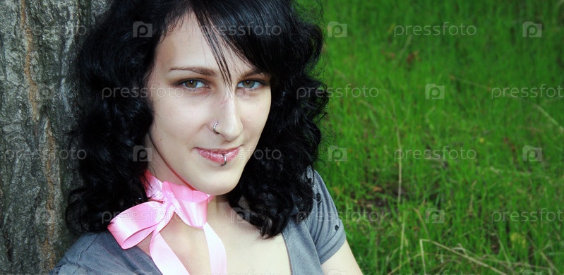 Темноволосая девушка с пирсингом и лентой на шее в парке