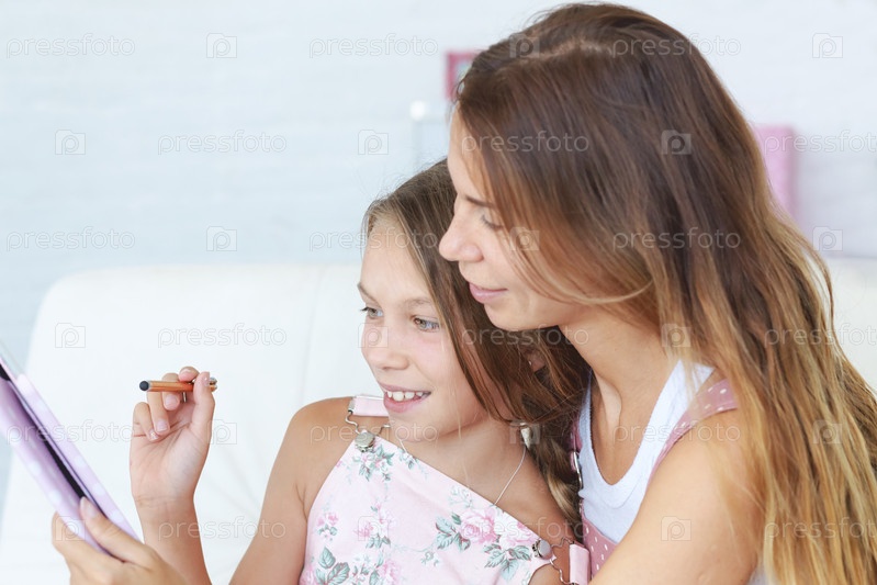 Мать с дочерью играют на планшете