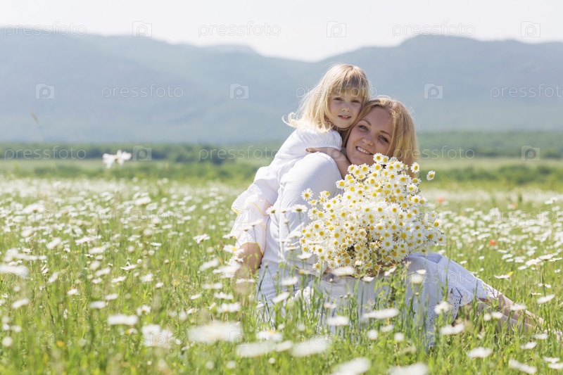 Мать с дочерью на цветочном поле