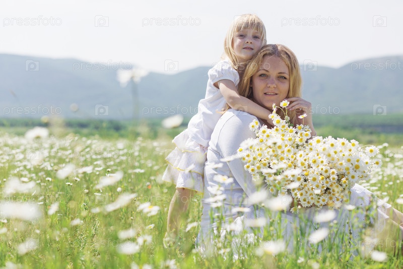 Мать с дочерью на цветочном поле