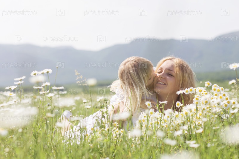 Мать с дочерью на цветочном поле