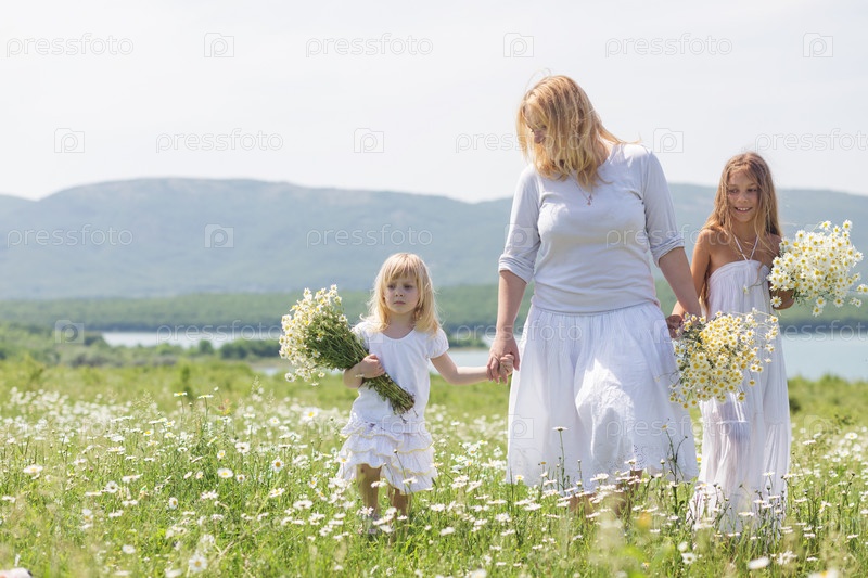 Мать с дочерьми на цветочном поле