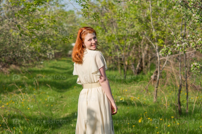красивая рыжеволосая девушка ходит в яблоневом саду