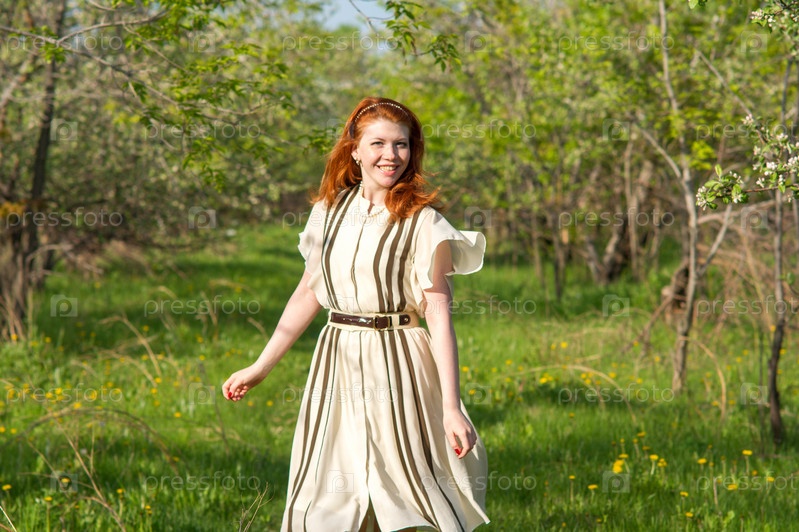 красивая рыжеволосая девушка ходит в яблоневом саду