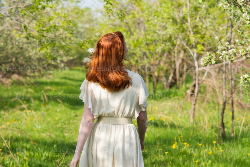 красивая рыжеволосая девушка ходит в яблоневом саду