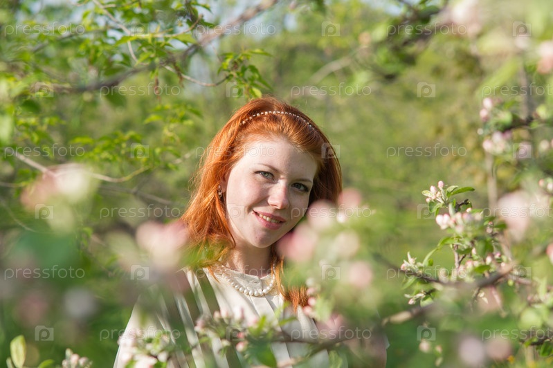 красивая рыжеволосая девушка ходит в яблоневом саду