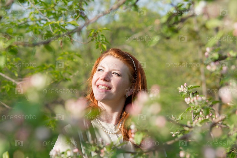 красивая рыжеволосая девушка ходит в яблоневом саду