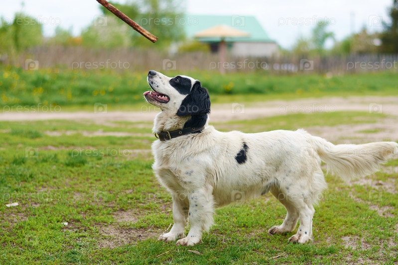 Русский спаниель, играя с палкой
