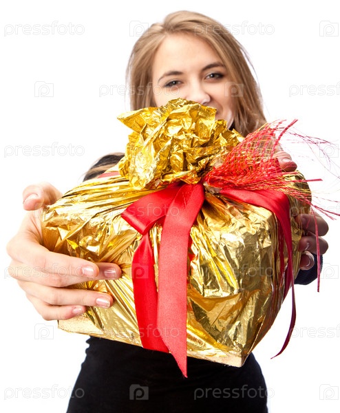 Портрет молодой девушки с подарком на белом фоне