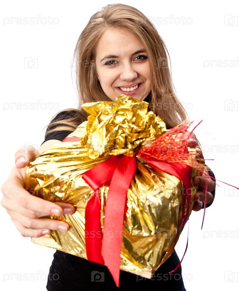 Портрет молодой девушки с подарком на белом фоне