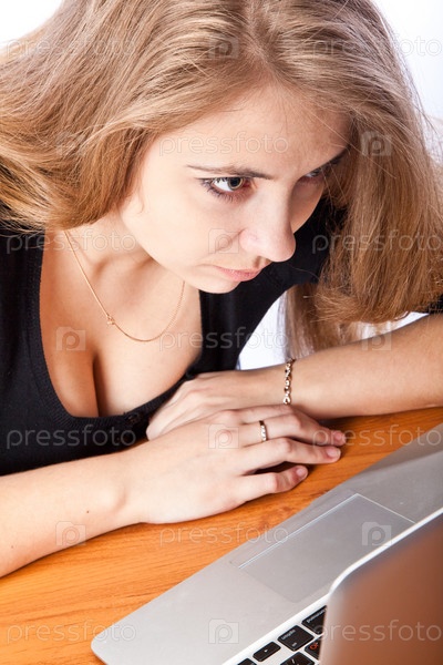 Портрет молодой девушки с ноутбуком, сидящей за столом на белом фоне