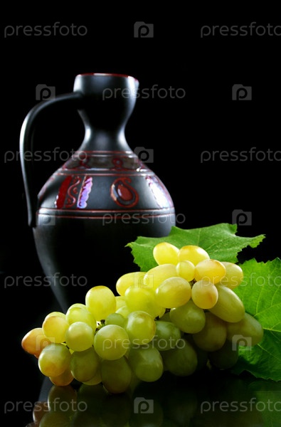 Гроздь винограда и кувшин на черном фоне