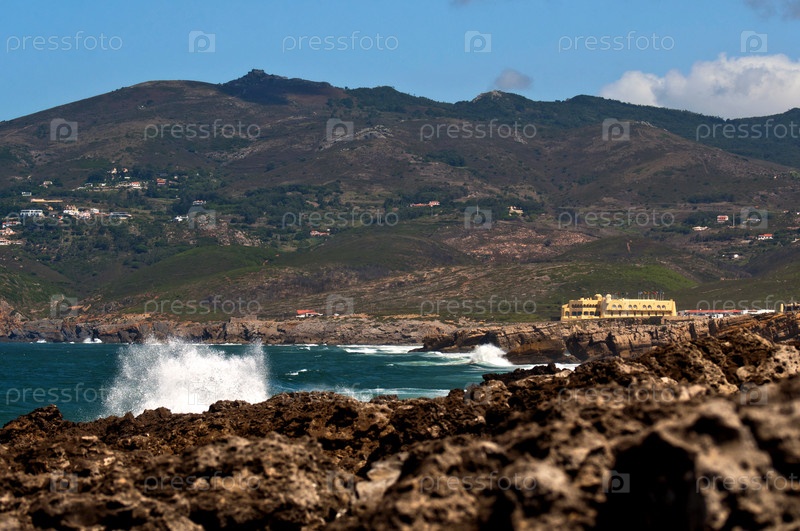 Волны разбиваются о скалистый морской берег